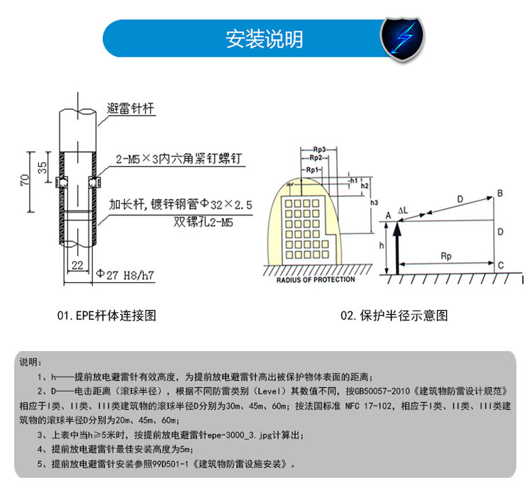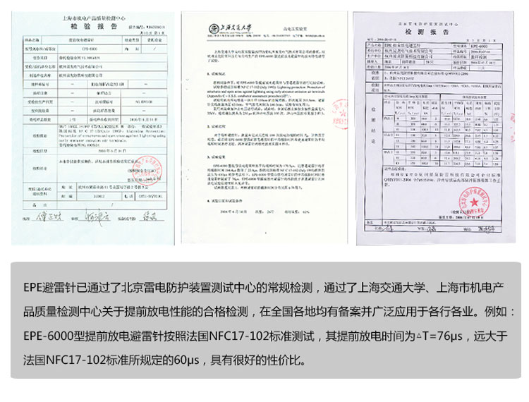 EPE系列提前放電避雷針(以下簡(jiǎn)稱EPE避雷針)采用法國(guó)技術(shù),符合法國(guó)NFC17-102標(biāo)準(zhǔn)。它由三種系統(tǒng)(大氣電力電容器、高壓脈沖發(fā)送系統(tǒng)、電流泄放系統(tǒng))組成,具有雙重瞬間放電裝置,被多層的具有隔絕惡劣環(huán)境及水密性的材料所保護(hù);無老化危險(xiǎn),免維護(hù)。在相同的安裝高度下,比普通瞬間避雷針的保護(hù)半徑大數(shù)倍,搶先放電時(shí)間為30μs~60μs,即優(yōu)先引雷入地。