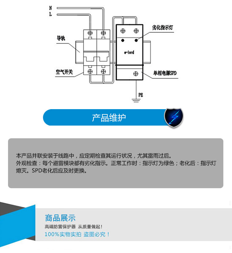 1. 已有可靠接地系統(tǒng),在配電柜(避雷器安裝處)的接地樁 (條)上進(jìn)行接地電阻的測(cè)定,電阻應(yīng)符合相關(guān)規(guī)范要求。 (或滿足國家、部級(jí)標(biāo)準(zhǔn))。 2. 配電柜中應(yīng)留有安裝避雷器的空間, 注:L為電源相線;N為電源零線;PE為地線。 | 應(yīng)檢查空氣開關(guān)已經(jīng)合閘導(dǎo)通,以保證避雷器處于運(yùn)行狀態(tài); 不要在雷雨天安裝。 |